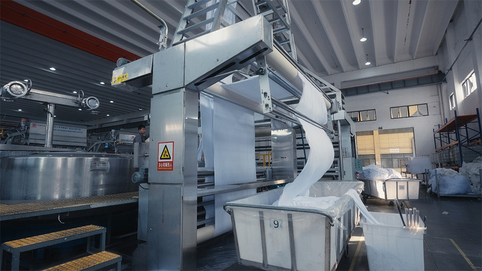 The company has spent years building towards a more integrated chain of warping, weaving, washing, dyeing, coating and R&D, with Karl Mayer warp-knitting equipment, open-width washing, 3.2-metre dipping and setting lines, and 5-metre coating capability. The benefit is not just capacity. It is control: stable temperature, even tension, fewer defects, improved surface uniformity, reduced shrinkage and greater consistency across wide-format digital textiles and coated materials.