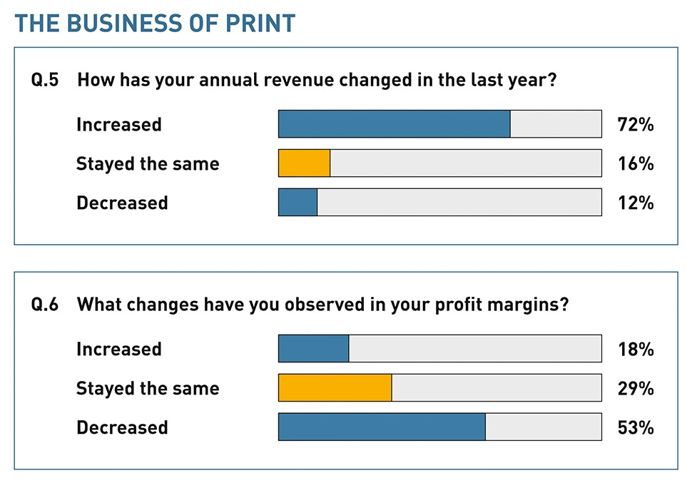 Switching to the ‘Business of Print’, this revealed some sense of positivity, with 72% of respondents saying they had seen revenue increase in the past year. However, just 18% had seen profit rise on the back of this, with 53% reporting a decline.